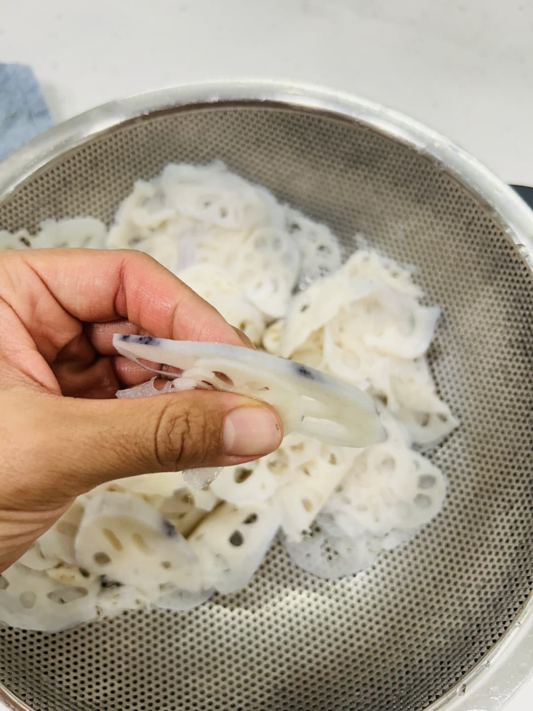 그다음에 연근을 한번 데쳐줄거에요. 끊는물에 식초 2~3큰술을 넣고 연근을 1분 정도 데치고 찬물에 헹궈주면 아삭한 식감이 살아나요.